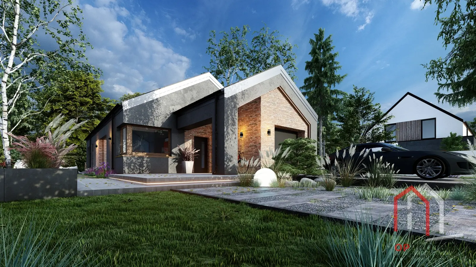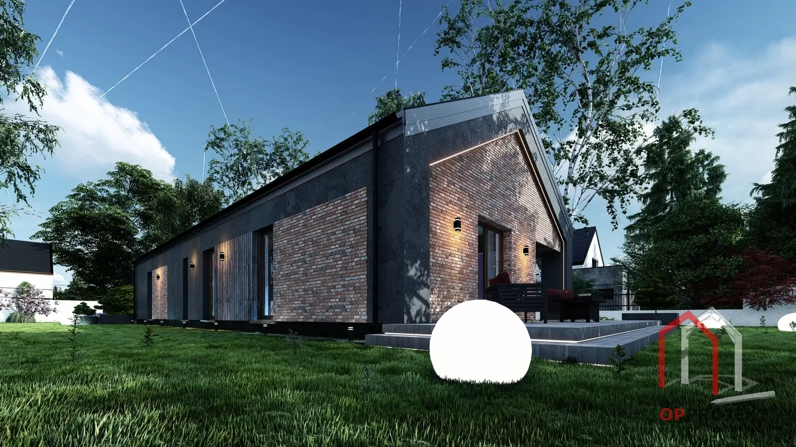 Wariant z czarnym tynkiem zestawionym z czerwoną cegłą – wyrazisty kontrast i ponadczasowy charakter.