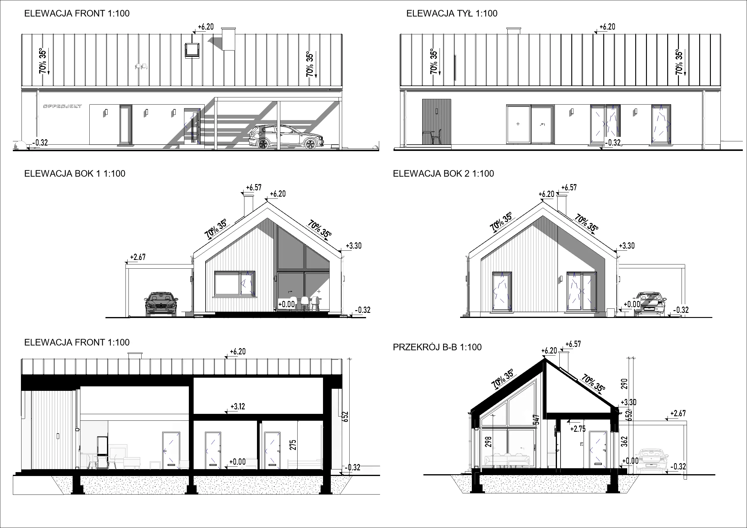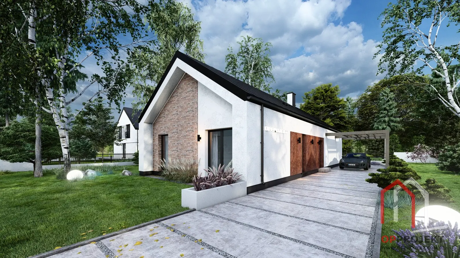 ELEWACJA: tynk biały, tynk czarny, cegła, deska elewacyjna