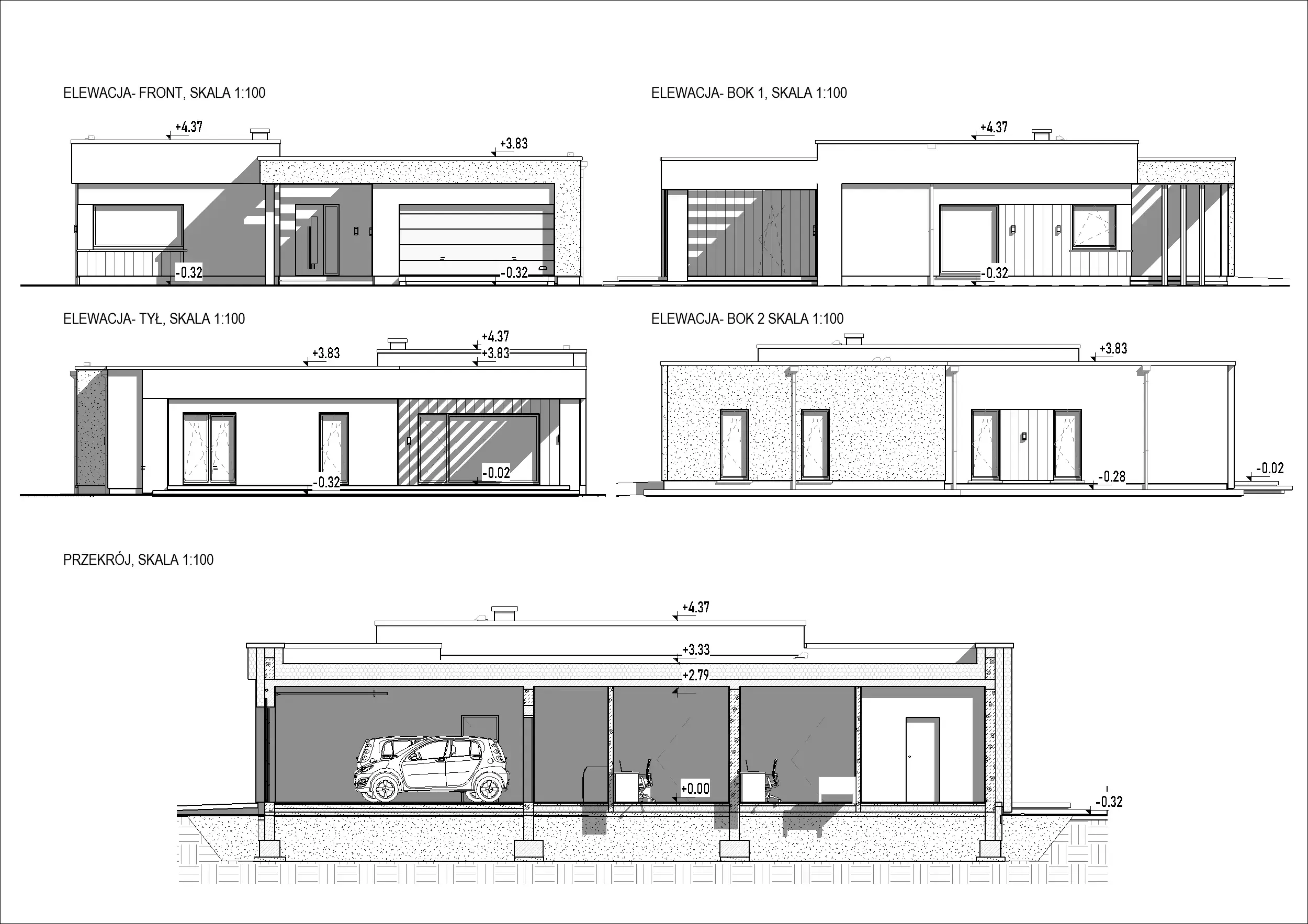 ELEWACJA: tynk biały, tynk czarny, deska elewacyjna, cegła, beton arch.