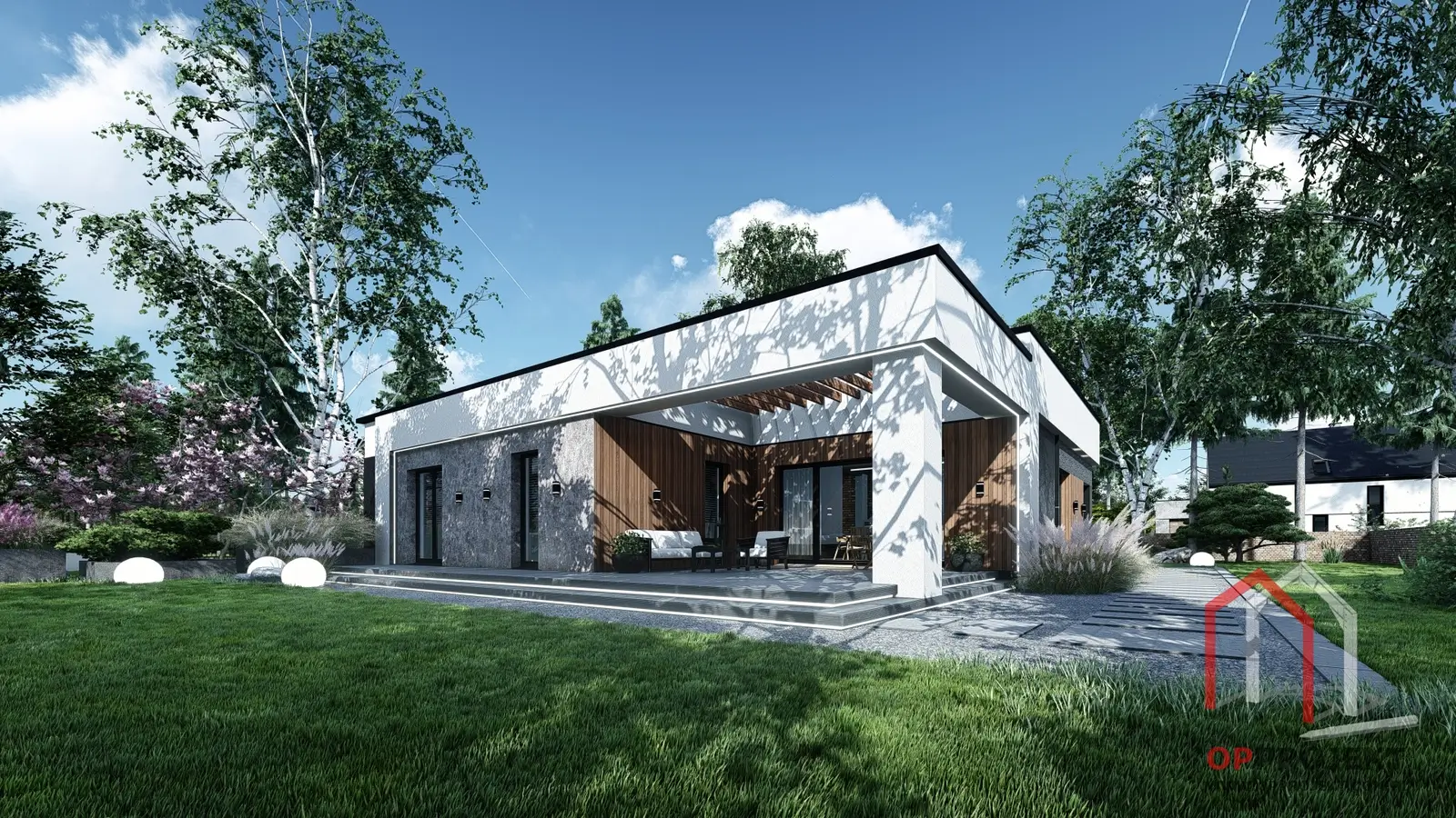 ELEWACJA: tynk, deska elewacyjna, cegła, beton arch.