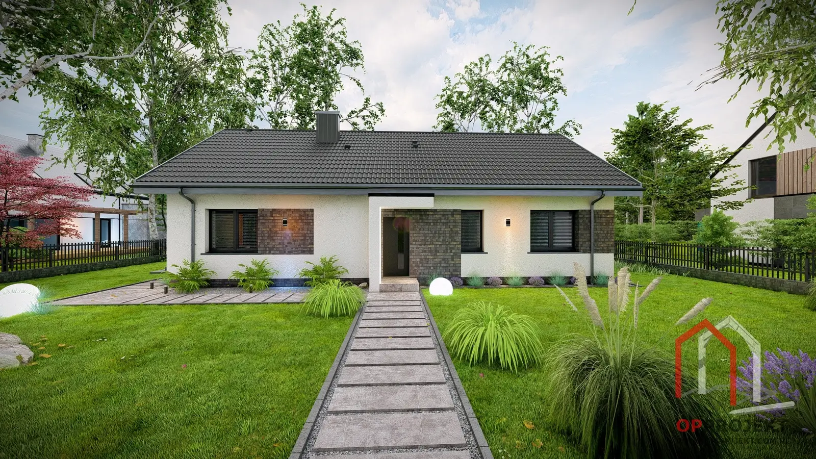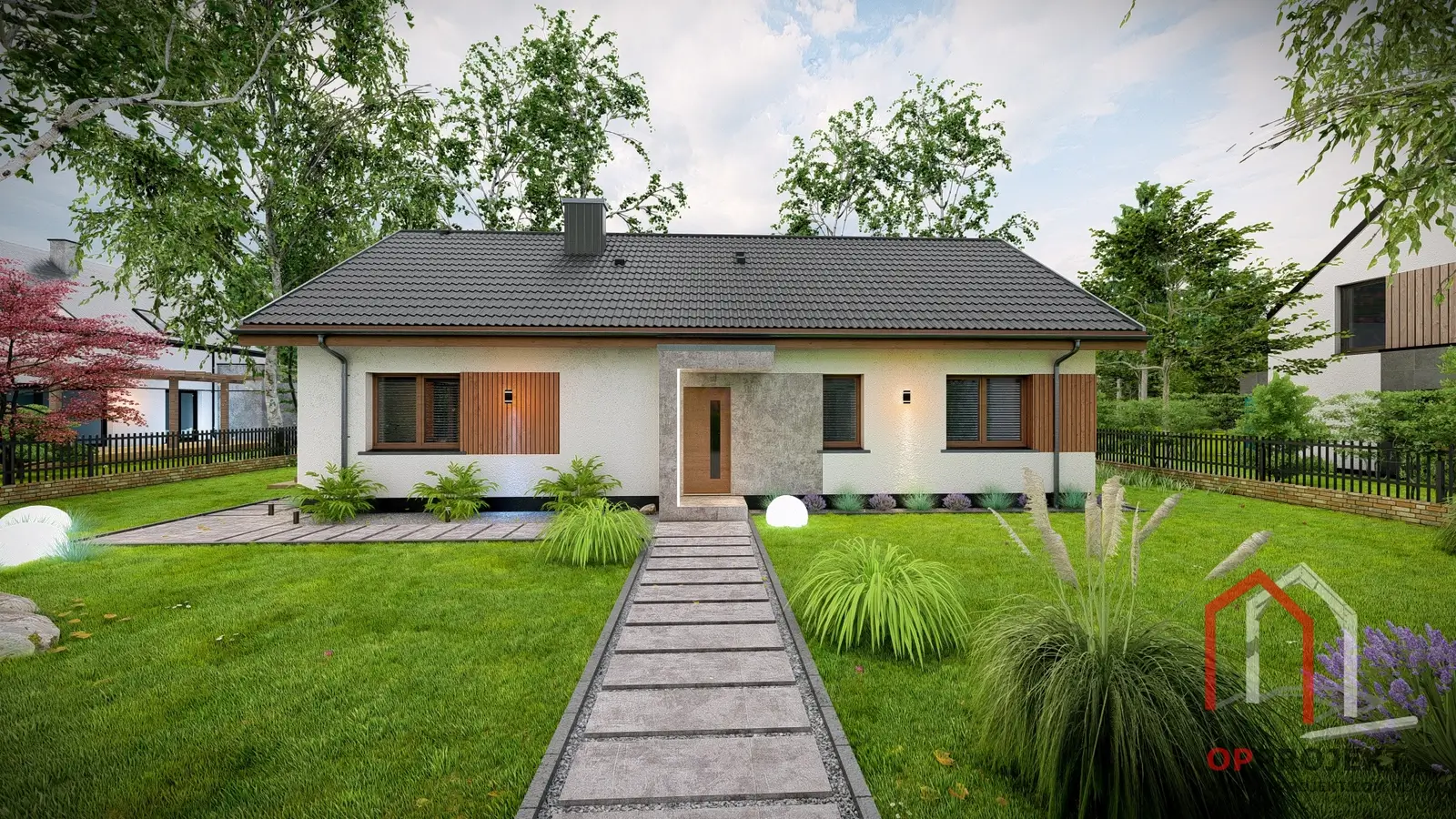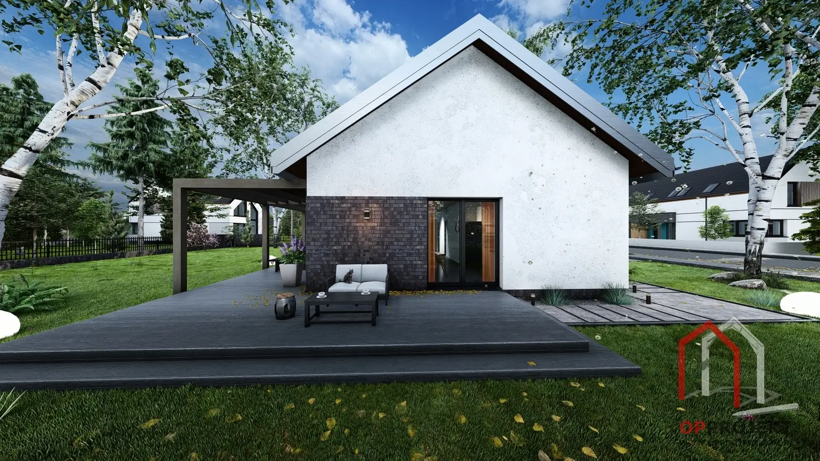 Aby każdy mógł dopasować dom do swojego gustu, przygotowaliśmy trzy propozycje wykończenia elewacji: klasyczny wariant z tynkiem i deską elewacyjną, nowoczesny z elementami czarnej cegły oraz ponadczasowy z akcentami czerwonej cegły.