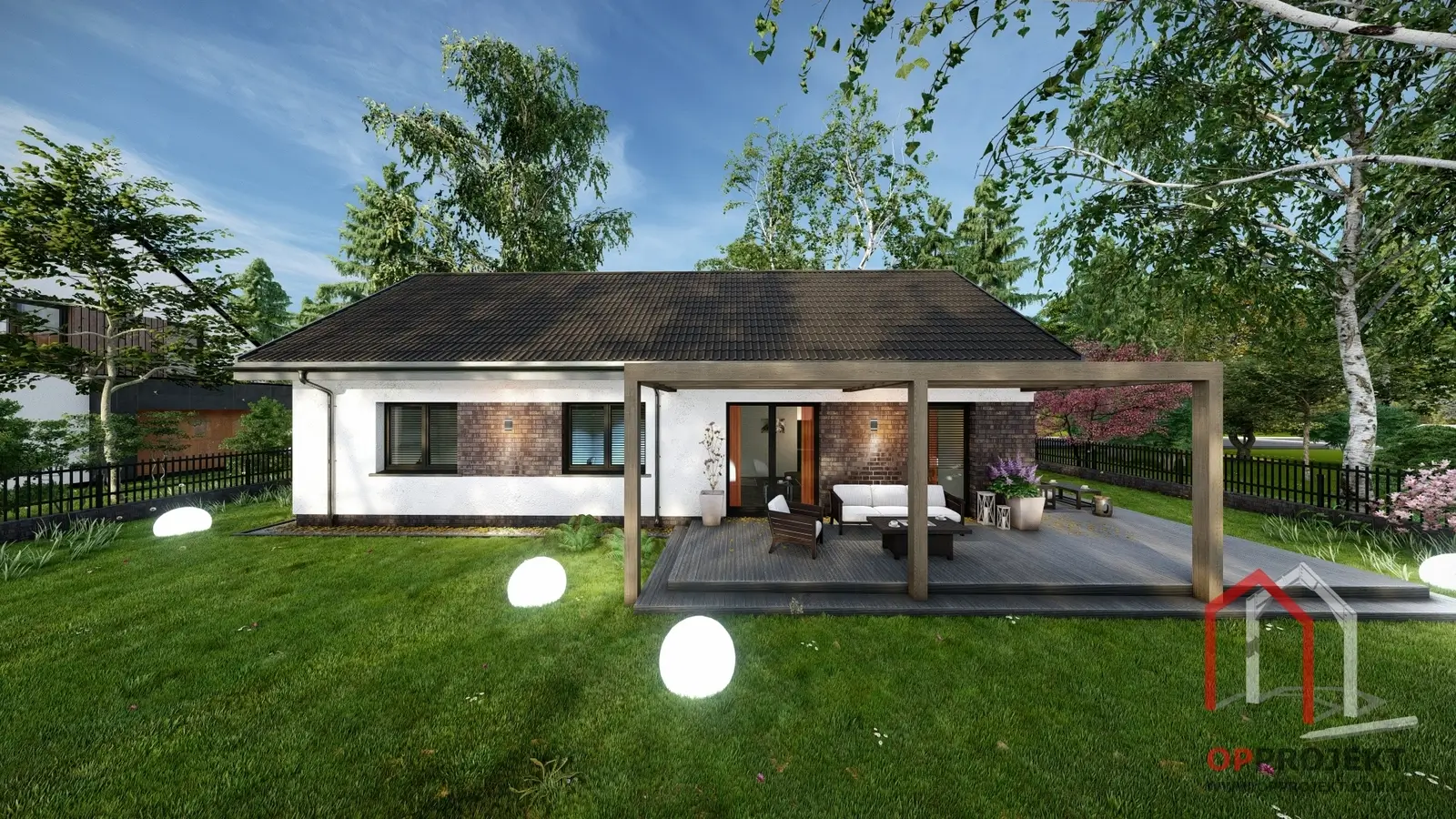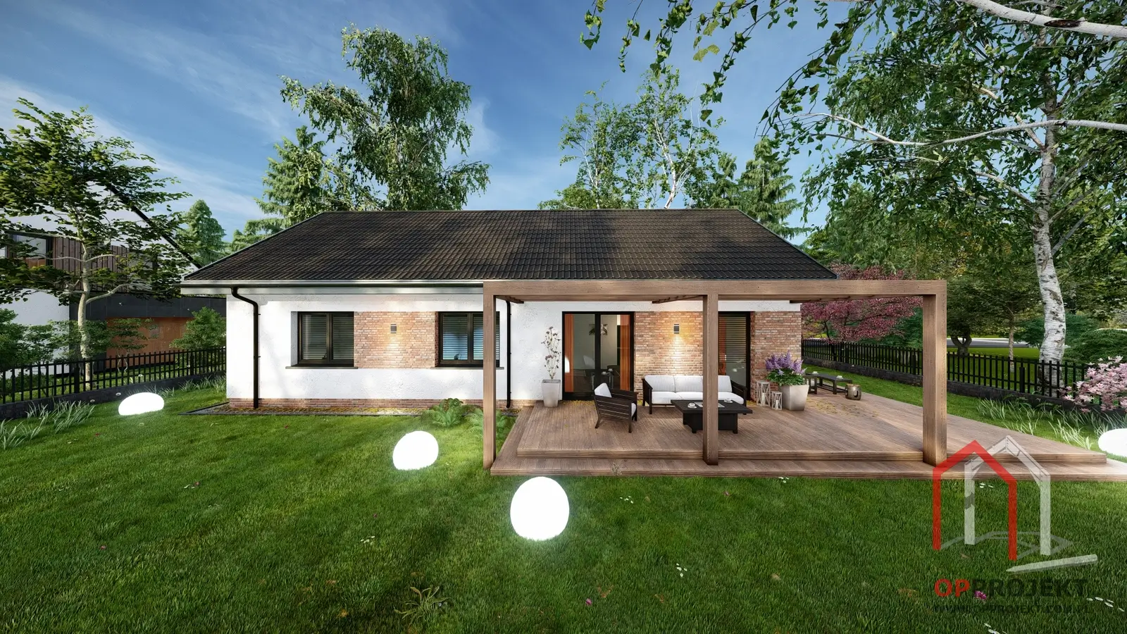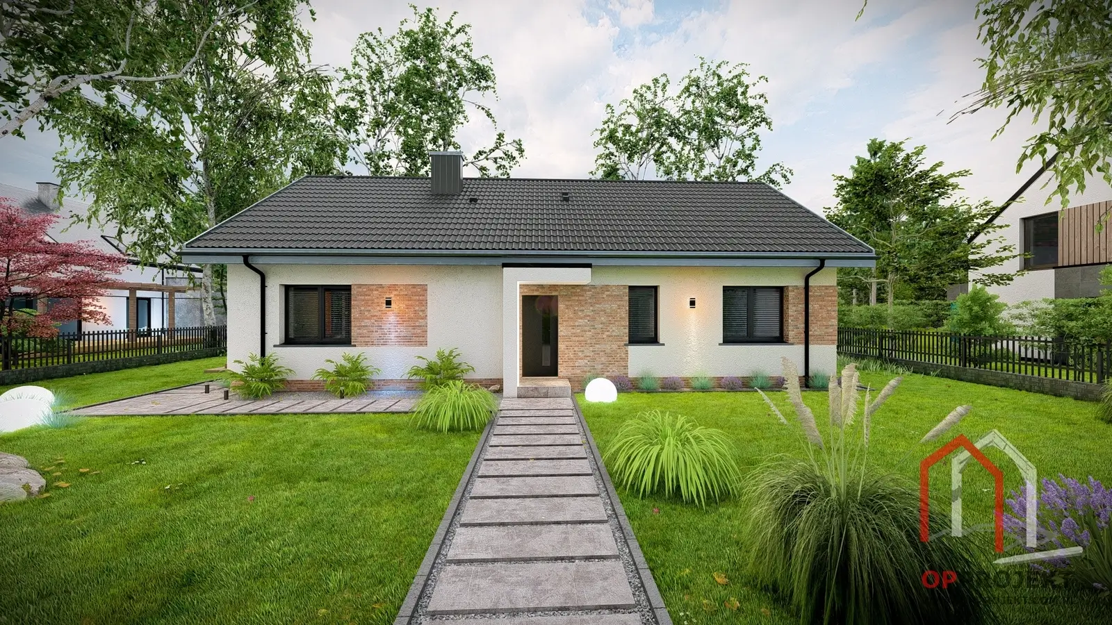 Aby każdy mógł dopasować dom do swojego gustu, przygotowaliśmy trzy propozycje wykończenia elewacji: klasyczny wariant z tynkiem i deską elewacyjną, nowoczesny z elementami czarnej cegły oraz ponadczasowy z akcentami czerwonej cegły.